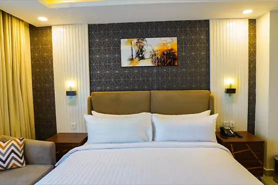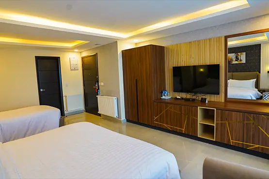 Enjoy round-the-clock room service, high-speed internet, and the cozy embrace of central heating. Entertainment is elevated with a grand 55-inch media TV.