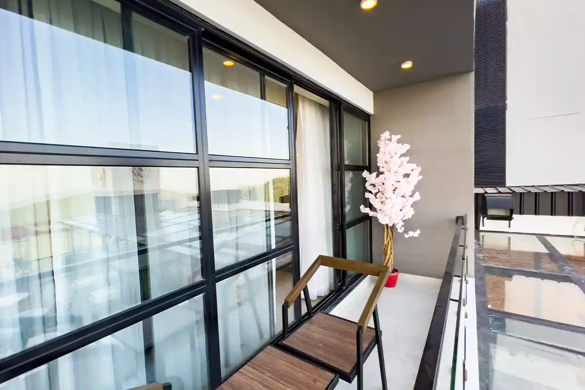 Indulge in lavish comfort as you enter this opulent abode, featuring a sumptuous bed and an ensuite bathroom complete with a rejuvenating shower and a relaxing bathtub. Step out onto your private balcony and savor the breathtaking views of the mountains.