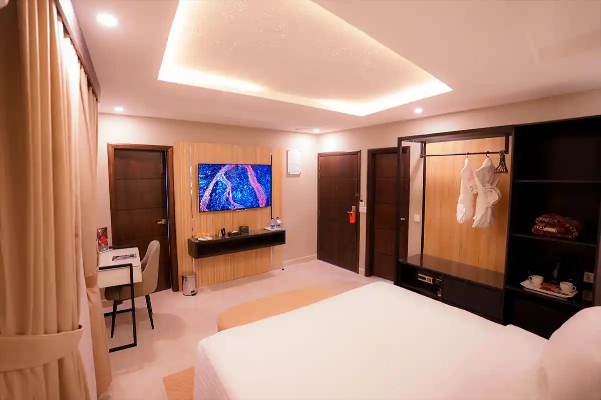 Enjoy seamless connectivity with high-speed internet, unwind with a 55-inch media TV, and take advantage of our efficient room service. Central heating and fresh air ducts ensure year-round comfort, while a digital locker keeps your belongings safe. Complimentary gym access is also included.