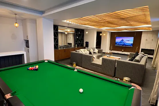 Fiora Sky Suite has a full-size bed, a large wardrobe, a family dining table, and a seven-seater couch. There is also a seating area on the terrace to enjoy the majestic views of the mountains. Additionally, the gaming setup is also fully furnished with comfortable seats.