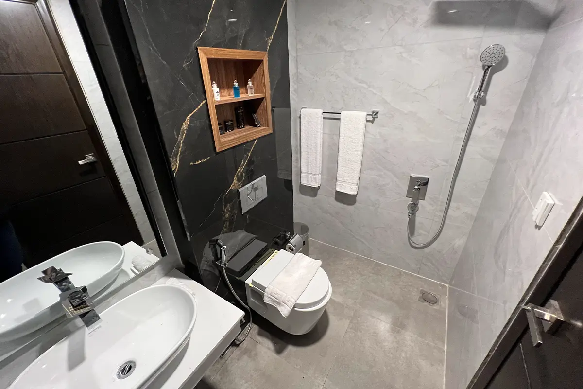 Not only are the rooms well-maintained, but the bathrooms are also well-equipped. It has everything you need, including a basin, self-care products, a pleasant hot shower, and bathrobes. Additionally, a dryer and bathroom mirror are available to help you get ready and look your best.