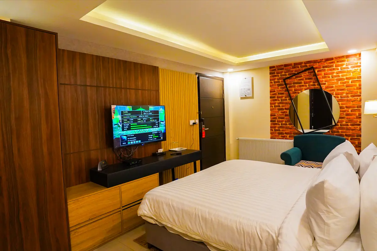 This room has five pieces of furniture. A plushy bed with two side tables. A sofa, and a spacious wardrobe to store your luggage.