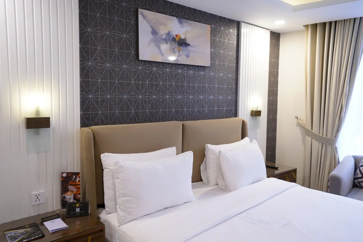 A plush king-size bed with an additional mattress can accommodate more people, allowing them to enjoy Fiora's room services.