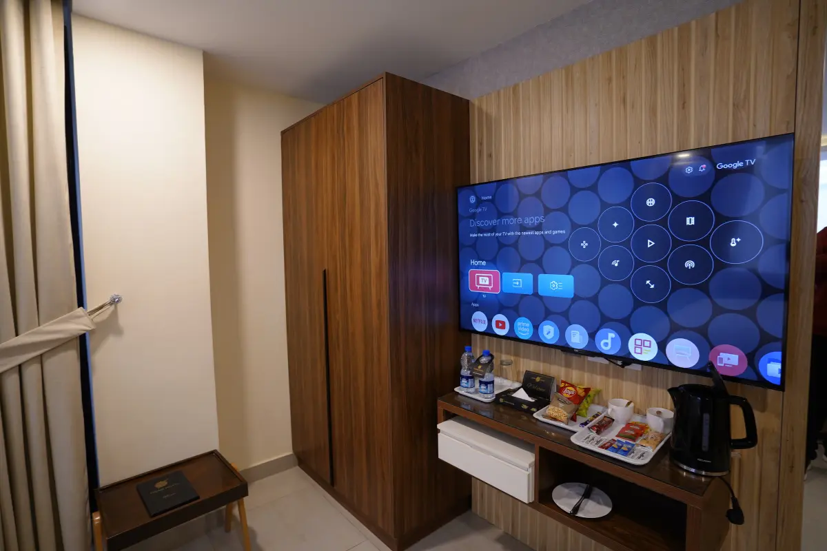 Our studio room features a comfortable bed for a restful night. A sitting corner is set with a sofa cum bed to enjoy while having a good time watching TV. A room has a wardrobe with a router design to store your luggage.